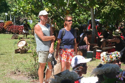 Am letzen Tag wurde dieser riesiger Stein mit einer feierlichen Zeremonie eingeweiht. Der König von den Osterinseln fertigte ihn selbst an. Es wurden viele Reden gehalten, Präsente untereinander verteilt und die Tänzer aus Huahine gaben ihr Bestes. Knapp 4 Stunden saßen die Familien in glühender Sonne, denn es gab nur wenig Schatten. Einige Palmenwedel und Sonnenschirme wurden organisiert, Wasserflaschen verteilt. Auch wir halfen einer Prinzessin von den Cook Inseln mit unserem alten Knirps-Regenschirm aus. All diese Maßnahmen halfen nur wenig aber alle hielten bis zum Schluß aus, keiner verließ vorzeitig die Feierlichkeit.