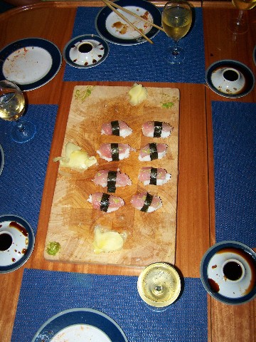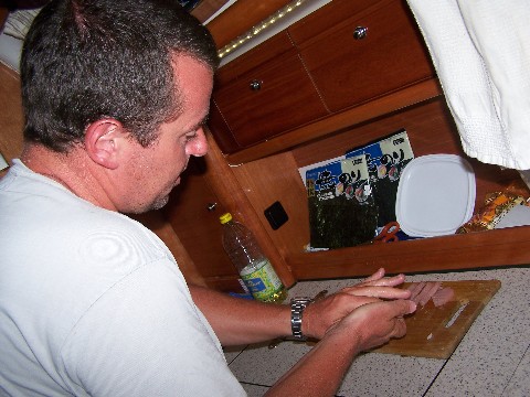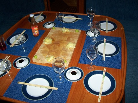 Leider war Martin, Dirma und klein Boaz von der DINGO nicht dabei aber wir restlichen acht Segler, von der HAFSKIP, der ROTOR, der YAGOONA und von der MULINE ließen es sich gut schmecken. Marc veranstalltete ein kleines Schau-Kochen. Er hatte vor einiger Zeit in Hamburg an einem Kochkurs für asiatisches Essen teilgenommen und zeigte uns nun seine Künste.....und die waren hervorragend!