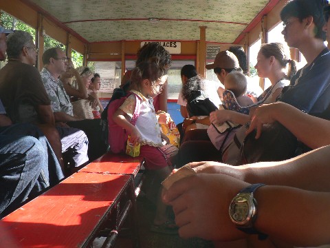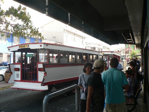 Hier ist eine Bushaltestelle zu sehen. Die Busse nennt man hier auf Tahiti Le Truck. Das sind umgebaute LKWs, die statt ihrer Ladefläche jetzt eine Fahrgastkabine mit langen Sitzbänken verpasst bekommen haben. Das ist nicht ganz so komfortabel, aber man sitzt dichtebei am polynesischem Leben. Die Fahrt ist günstig und kostete pro Person umgerechnet 1 Euro. Es gibt natürlich Haltestellen, aber man kann die Busse auch auf der Strecke heranwinken. Sehr praktisch.