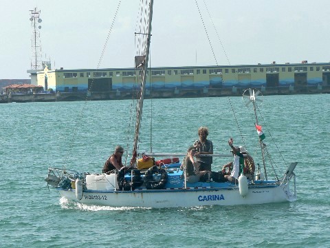 ...........Aron mit seinem 6 Meter Boot, der Segelyacht CARINA. Oder besser gesagt, mit seiner Jolle CARINA. Wir hatten ihn das erste Mal in Cartagena in Kolumbien und später in Colon in Panama getroffen, wo er auch auf seine Passage durch den Panamakanal wartete. Aron, um die 30 Jahre, kommt aus Ungarn gesegelt und ist ebenfalls auf dem Weg, die Welt zu umrunden. Mittlerweile kennt ihn und sein Boot fast jeder Segler. Die CARINA ist mit der Zeit stark gezeichnet von den langen Überfahrten über den Pazifik und den oftmals strammen Passatwinden. Aber Aron erfährt von überall viel Hilfsbereitschaft. Für uns immer noch beeindruckend ist seine Passage durch den Panamakanal. Es war damals Pflicht, vier Leinenhänder plus den Skipper, an Bord zu haben und dazu kam noch der Lotse. Zusätzlich mußte jedes Boot vier 40 Meter lange Leinen parat haben und ausreichende Fender besitzen. Das hieß für Aron, noch zwei große Autoreifen auf jeder Seite anzubringen. Als damals die CARINA mit ihrer sechsköpfigen Besatzung den Ankerplatz in Colon Richtung der riesigen Schleusen verließ, standen viele Segler auf ihren Booten, winkten, schossen Fotos und tuteten zum Abschied durch ihre Nebelhörner. Das war ein Bild, seht selbst