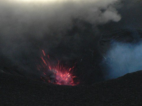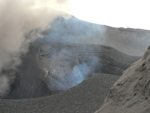 Rings um den Vulkankegel lagen überall Gesteinsbrocken unterschiedlichster Größen verstreut. Vor ein paar Jahren war hier ein Japanischer Tourist ums Leben gekommen. Er ist von einem dieser umherfliegenden Brocken erschlagen worden. Stanlay berichtete uns auch, dass es an manchen Tagen nicht möglich sei, den Vulcan zu besteigen. Zu viele umherfliegende, glühende Steine würden das dann verhindern. Aber wir hatten Glück. Die Steine kamen nicht weiter als bis zum inneren Kraterrand.