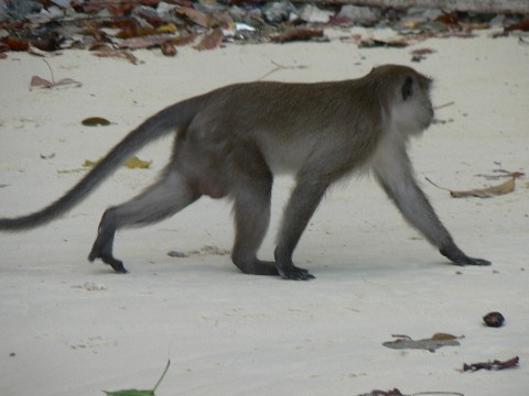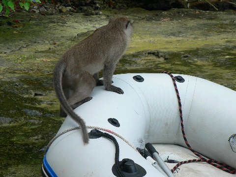 Morgens vor dem Start zur Insel Phuket entdeckte Stefan in der nahegelegenen Bucht Affen. Burt, Stefan und ich fuhren sogleich, bewaffnet mit einer Kamera, in die Bucht. Nirgends hatten wir gelesen, dass sich genau gegenüber unseres Ankerplatzes die sogenannte Affenbucht befinden sollte. Tja und wir hatten Glück....