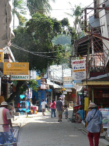 Phi Phi Don, wie die große Hauptinsel der Gruppe heißt, biete viele Kontraste. Auf der einen Seite findet man hier eine wunderschöne Natur mit seinen Felsen und Stränden und auf der anderen Seite steppt hier der Bär....Ein Touristen Shop nach dem anderen und alle verkaufen das gleiche. Es gibt teure Brillenläden, Markenklamotten und eine Vielzahl von Kneipen, Diskotheken und Restaurants.