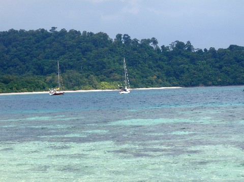 Nun konnten wir uns den anderen Sachen widmen. Zum einem mußten wir Trinkwasser organisieren. Da es in Ao Chalong keine Marina gab, in der wir bequem unseren Tank mit Wasser auffüllen konnten, mußten wir die 180 Liter per Dingi auf unsere MULINE schaffen. Das war in der sengenden Sonne etwas schweißtreibend, aber kaum zu vermeiden. Dann wollten wir noch frische Sachen wie Kartoffeln, Zwiebeln und Obst einkaufen und da bot der kleine Ort Chalong eine gute Gelegenheit. Nach ein zwei Tagen hatten wir tatsächlich das Gröbste erledigt und da unser Besuch von Reinhard und Rita erst in fünf Tagen eintraf, segelten wir noch zu den 13 Seemeilen entfernten Raya Islands. Marc und Svenja waren ebenfalls mit ihren Erledigungen fertig und segelten mit uns dorthin.