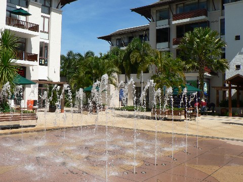 Diese Springbrunnenanlage erregte unser aller Interesse. Das Wasser kam im unterschiedlichen Rhythmus aus den Düsen. Es war fast eine kleine Komposition und war wunderschön zu beobachten. Besonders wenn es bereits dunkel war. Dann wurde jede einzelne Wasserdüse mit zwei Lichtern untermalt. Aber nicht nur das war reizvoll. Zugleich weckte es in uns Erwachsenen die Überlegung, wie man trocken durch dieses Feld von 36 Wasserdüsen kommen könnte und kaum hatten wir das zu Ende gedacht machte Yannic mit seinen Proben den Anfang. Dann folgten wir Erwachsen, es war ein wirklich lustiges Spiel, das damit endete, dass alle, bis auf Herbert, fast komplett nass waren.