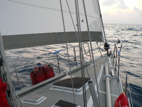 Das Wetter war uns wirklich holt. Wir machten gute Fahrt über Grund. Dabei half uns nicht nur der Wind mit seinen konstanten 4 Beaufort, sondern auch die mit uns setzende Strömung. Im Schnitt hatten wir 1-2 Knoten mit uns und unsere Logge, der Geschwindigkeitsmesser, zeigte uns regelmäßig Geschwindigkeiten um die 6,5 Knoten an. Zeitweise liefen wir sogar 8 Knoten, das ist ein Speed, den wir nur selten auf unserer Logge sehen.