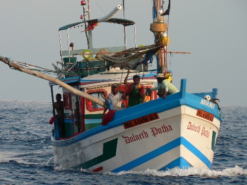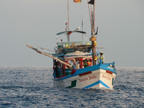 Südlich von Sri Lanka begegneten wir diesem Fischerboot. Wir hatten schon über Funk von den vor uns segelenden Booten gehört, dass viele Fischerboote unterwegs sein sollten. Die YAGOONA zum Beispiel und der Katamaran YARA hatten bereits Kontakt zu den Fischern. Die Fischer fragten nach Zigaretten und Bier und als Gegenleistung hielten sie ihre Fische hoch.