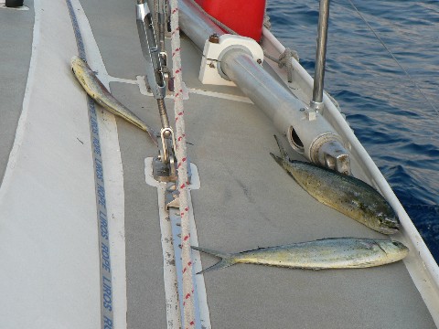 Diese drei Mahi Mahis wurden sofort be- und verarbeitet. Gegen Mittag gab es dann gleich Poisson Cru, wie wir es auf den Marquesas in den Gesellschaftsinseln kennengelernt hatten. Kleine rohe Fischstücke mariniert in Zitronensaft und dann gemischt mit Zwiebeln, Tomaten, Gurken und leckerer Kokosmilch, gewürzt mit Salz und Pfeffer. All das hatten wir an Bord. Nur Zitronengras aus dem Originalrezept fehlte. Am nächsten Tag gab es den restlichen filetierten Fisch, gebraten mit Butter in der Pfanne.