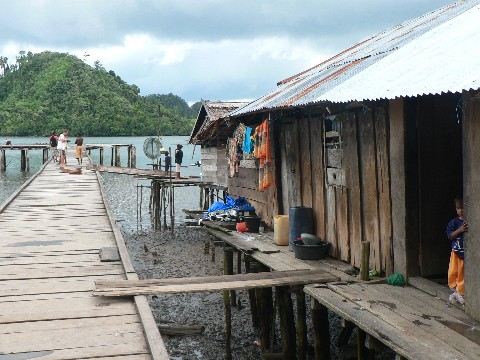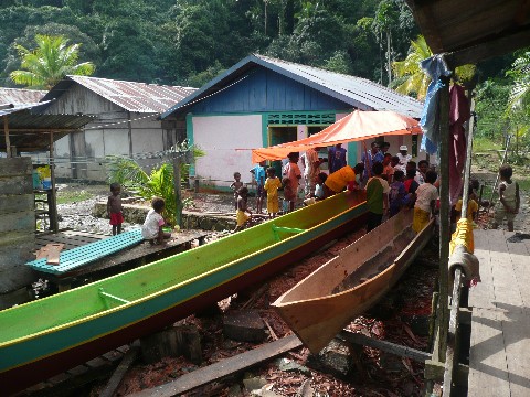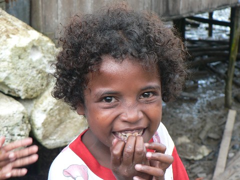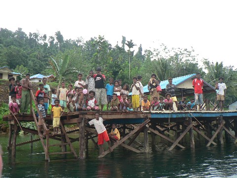 Leider war es mit der Kommunikation etwas beschwerlich. Keiner im Dorf konnte annähernd etwas Englisch. Gut das wir von Pan dem Polizisten aus Jayapura ein Wörterbuch geschenkt bekommen hatten. So konnten wir wenigstens einige Wörter heraussuchen und den einen oder anderen nach ihren Namen fragen oder dem Alter oder ob er verheiratet sei. Aber nichts desto trotz wurden wir freundlich aufgenommen und das halbe Dorf begleitete uns bei unserem Rundgang.
