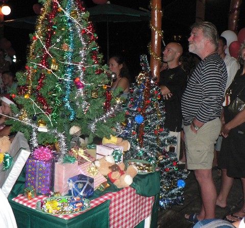 Um sieben Uhr waren wir mit Marc, Svenja und Frank, ihrem Bruder in der Mini-Strandbar verabredet. Und wir konnten es kaum gauben, zehn Minuten vor sieben Uhr fing es an wie aus Kübeln zu gießen. Seit über drei Wochen hatten wir keinen Regen gesehen und pünktlich zu Heilig Abend goß es wie aus Eimern. Frank meinte später zu uns, ...und dafür fliege ich nach Thailand, dass kann ich auch in Deutschland haben... Er hatte fast Recht . Denn Thailand ist nicht Deutschland und nach einer knappen halben Stunde hörte der Regen auf und wir konnten in leichter Bekleidung und Badelatschen mit unseren Dingis an den Strand fahren. Tja und das kann man in Deutschland zur Weihnachtszeit nicht haben.....