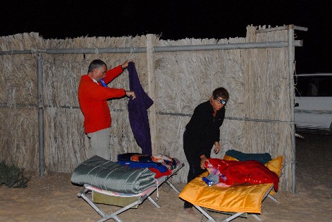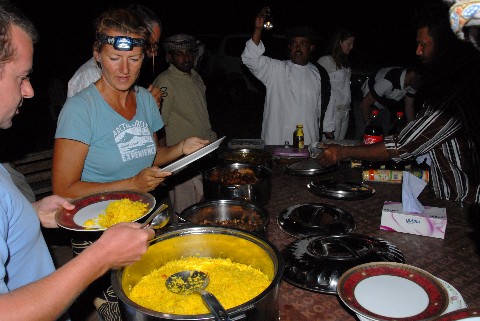 Währendessen wir in den Dünen waren, bereiteten vier andere Omanis köstliche Speisen für uns zu und zum verdauen danach richteten sie für uns ein bequemes Lager her, ganz in landestypischer Art. (oberes Bild)